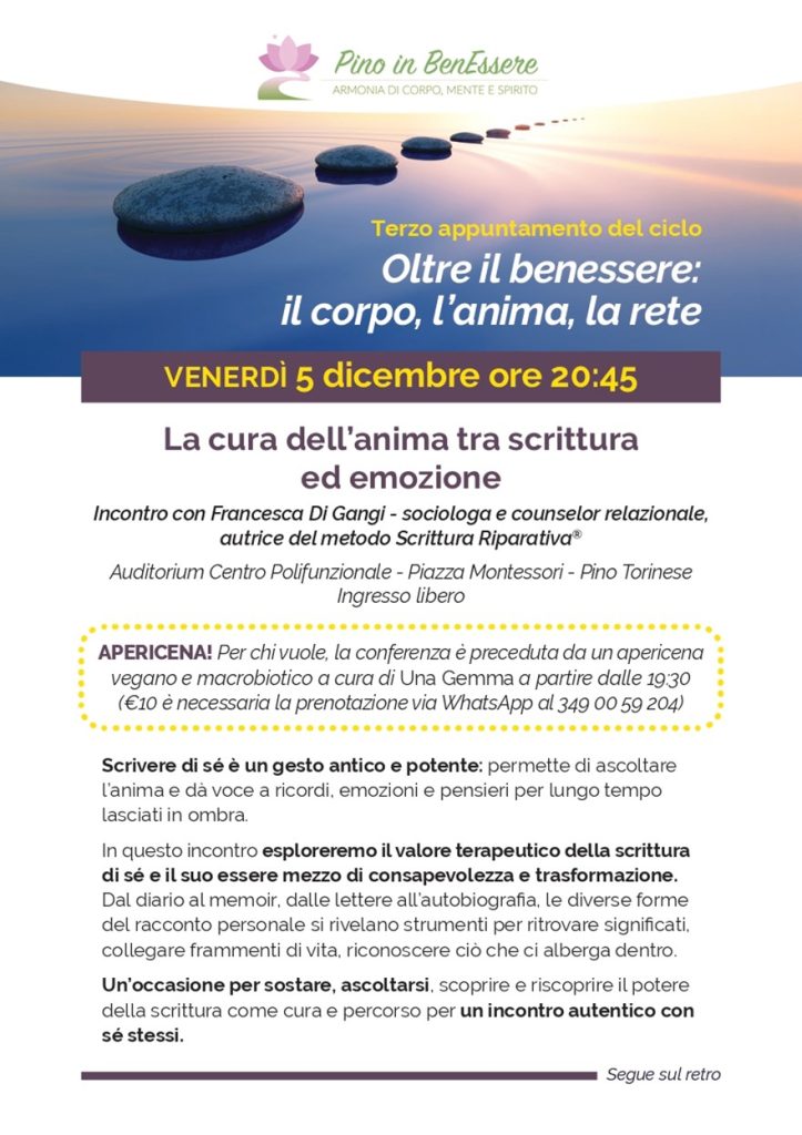 Pino Torinese. Venerdì 5 dicembre l’incontro “La cura dell’anima tra scrittura e emozione” per Pino in Benessere