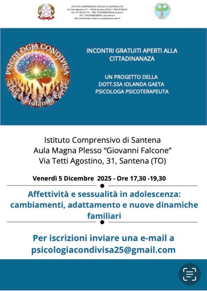 L’appuntamento è per venerdì 5 dicembre alle 17,30 nell’Aula Magna Giovanni Falcone dell’Istituto Comprensivo di Santena in Via Tetti Agostino 31 a Santena. Il tema che si affronterà sarà dedicato a “Affettività e sessualità in adolescenza: cambiamenti, adattamento e nuove dinamiche familiari”. L’età evolutiva, l’adolescenza, l’approccio alla vita adulta, creano sempre numerose problematiche all’interno della famiglia. L’incontro offrirà uno spazio di riflessione sui cambiamenti emotivi e corporei dell’adolescenza e su come questi influenzino l’immagine di sé, le relazioni e la comunicazione con gli adulti. Sarà un’occasione per comprendere meglio ciò che accade nelle famiglie quando i ragazzi cercano una nuova autonomia e per interrogarsi su come gli adulti possano sostenere questo passaggio con ascolto e consapevolezza. L’evento si svolgerà in modo diretto e dinamico, così da favorire partecipazione e dialogo. L’incontro è libero a tutti.