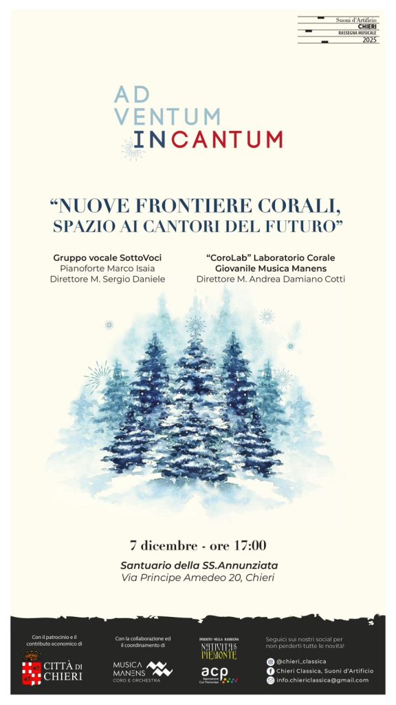 L’atmosfera di Natale arriva alla SS. Annunziata di Chieri domenica 7 dicembre alle ore 17 con il primo concerto in Santuario: “Nuove frontiere corali, spazio ai cantori del futuro.”
