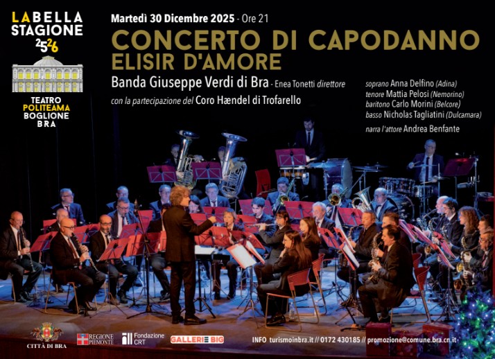 La Bella Stagione del Politema Boglione prosegue martedì 30 dicembre con il tradizionale Concerto di Capodanno “Elisir d’Amore” (fuori abbonamento) a cura della Banda “Giuseppe Verdi” di Bra. Biglietti disponibili al costo di 15 euro.