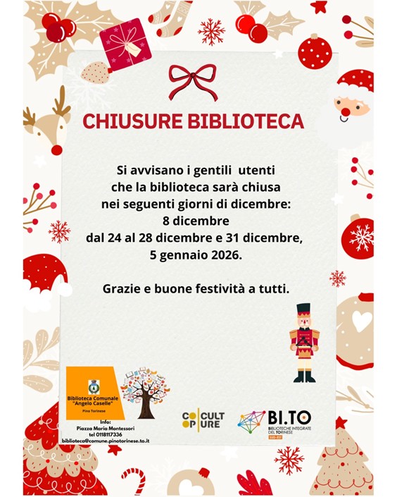 A Pino Torinese, nel periodo delle Feste natalizie la Biblioteca Civica “A. Caselle” sarà chiusa i seguenti giorni: