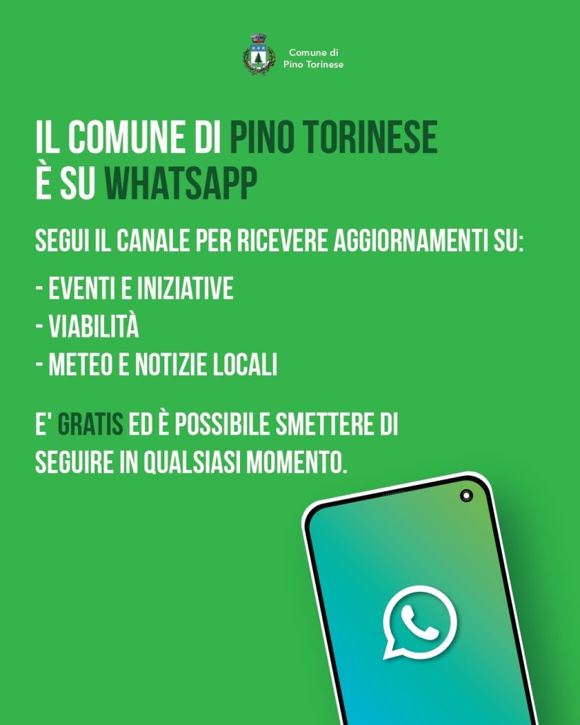 È attivo da oggi il nuovo canale WhatsApp del Comune di Pino Torinese, dove i cittadini potranno ricevere direttamente sul proprio smartphone novità importanti, avvisi e allerte in tempo reale. Saranno pubblicate notizie sugli eventi in programma, informazioni sui bandi in corso e sulle attività del Comune. L’immediatezza della notifica lo rende inoltre uno strumento particolarmente idoneo per le comunicazioni riguardo le allerte meteo e le modifiche alla viabilità. “Siamo felici di annunciare l’attivazione di questo canale – ha dichiarato la sindaca di Pino Torinese Alessandra Tosi – per avvicinarci ancora di più ai nostri cittadini e potenziare la comunicazione del nostro Comune. Da oggi informazioni importanti come un’allerta meteo o la chiusura di una strada, oltre agli eventi e le novità comunali, potranno arrivare direttamente in tasca dei pinesi in modo rapido e trasparente”. “Come amministrazione – ha commentato l’assessora con delega alla comunicazione istituzionale, Elisa Pagliasso – ci impegniamo a ricercare canali di comunicazione sempre più nuovi, aggiornati e immediati, per poter arrivare nel modo più efficace possibile alla maggior parte della popolazione”. L’iscrizione al canale avviene in pieno rispetto della privacy: il proprio numero, nome e immagine di profilo non sono condivisi con gli altri iscritti e non è possibile scrivere o rispondere alle comunicazioni. Sono anonime anche le reazioni, tramite emoji, che è possibile fornire in risposta a ogni messaggio. Per rimanere informati: