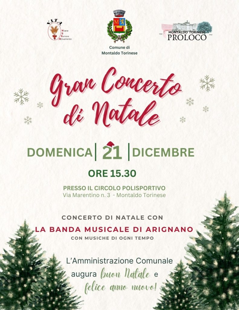 Sarà la Banda Musicale di Arignano diretta da Roberto Zucca a augurare buone feste a Montaldo. La poliedrica Banda proporrà i classici motivi natalizi con incursioni di musica classica e leggera. Sarà anche il momento per lo scambio degli auguri natalizi della comunità montaldese.