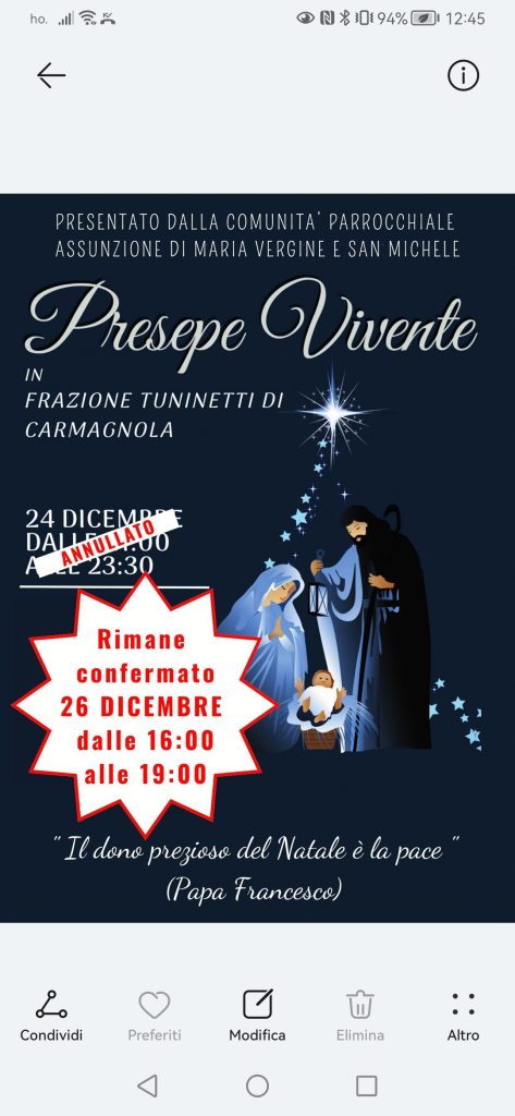 A causa del maltempo è stato deciso di annullare la rappresentazione prevista per la sera di mercoledì 24 dicembre. Confermato invece il presepe vivente il giorno di Santo Stefano, 26 dicembre, dalle 16 alle 19 presso Il Poggetto – Vicolo Lavagna – Tuninetti di Carmagnola (To).