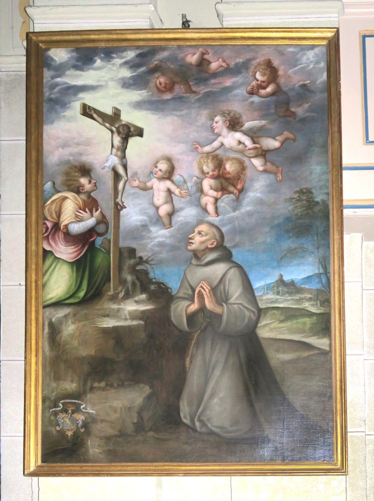 La chiesa parrocchiale di San Pietro in Supponito, situata nel centro di Villanova d’Asti, è molto ricca di opere d’arte. La più antica è l’affresco cinquecentesco, dipinto da un ignoto autore proveniente dall’Italia Centrale, raffigurante San Biagio tra le Sante Maria Maddalena e Lucia. Ma non minore importanza rivestono tre tele che hanno a che fare con Guglielmo Caccia detto “Il Moncalvo”. Una di esse, raffigurante San Francesco d’Assisi (fig. 1), è certamente opera autografa del pittore monferrino. Il Santo vi è raffigurato in ginocchio, insieme ad un angelo, entrambi in adorazione davanti al Crocifisso. La croce vi appare piantata su una roccia, accostata al tronco di un albero tagliato, con un chiaro simbolismo: la croce di Cristo ha annullato le conseguenze della disobbedienza di Adamo ed Eva. L’opera viene datata al 1608 (quando l’artista risiedeva a Chieri). In basso a sinistra vi compare lo stemma dei committenti, gli  Scarrone di Chieri, conti di Revigliasco.