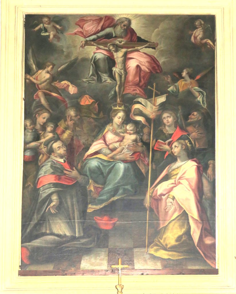 Gli altri due quadri richiamano lo stile del Moncalvo ma probabilmente sono di qualche suo allievo o di pittori che lo imitano. In uno di essi compare la Madonna col Bambino e le Sante Anna e Margherita d’Ungheria che distribuisce l’elemosina ai poveri (fig. 2). Nell’altro, attribuito ad un allievo di nome Pelizza Francesco e raffigurante la SS.ma Trinità insieme alla Madonna col Bambino e ai Santi Giuseppe,  Carlo Borromeo, Orsola, Rocco e Maria Maddalena (fig. 3), la raffigurazione della SS.ma Trinità è molto simile a quella che Giovanni Crosio, altro allievo del Moncalvo, ha dipinto per l’altare della cappella di San Giovanni Evangelista nel Duomo di Chieri.