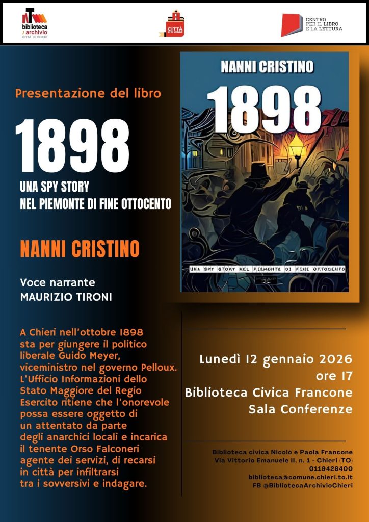 Lunedì prossimo, 12 gennaio, presso la sala conferenze della Biblioteca di Chieri – alle ore 17 – lo scrittore chierese Nanni Cristino presenterà il suo romanzo “1898”, ambientato a fine Ottocento a Chieri.