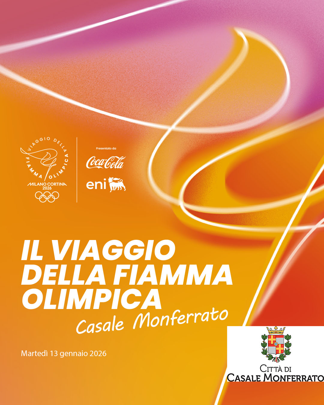 La Fiamma Olimpica farà tappa a Casale Monferrato martedì 13 gennaio 2026, con un percorso cittadino che prenderà avvio alle 15,26 da Oltreponte e si concluderà alle 16,28 in via Negri.