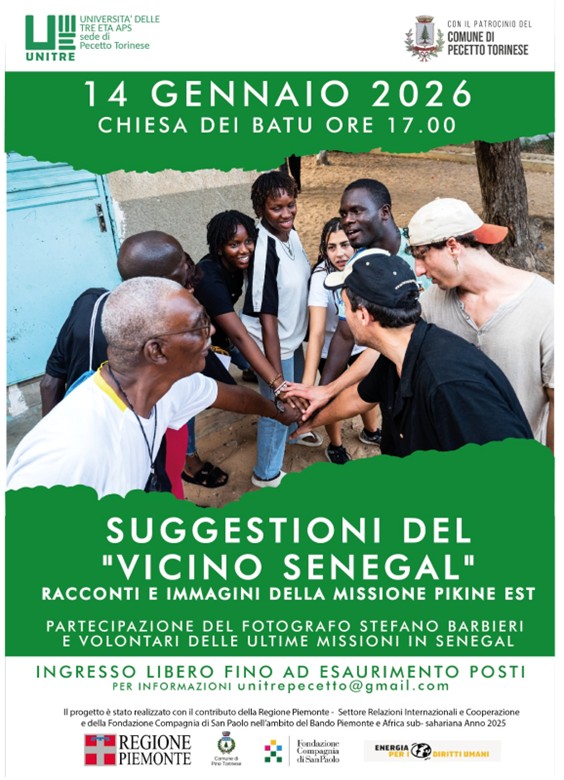 Alle ore 17,00 presso gli spazi della Chiesa dei Batù l’Unitre di Pecetto ha organizzato un interessante incontro dedicato alla realtà del Senegal attraverso i racconti dei volontari di Pino e Pecetto che hanno partecipato alle missioni degli ultimi anni in quel paese e alle immagini realizzate dal fotografo pecetttese Stefano Barbieri.