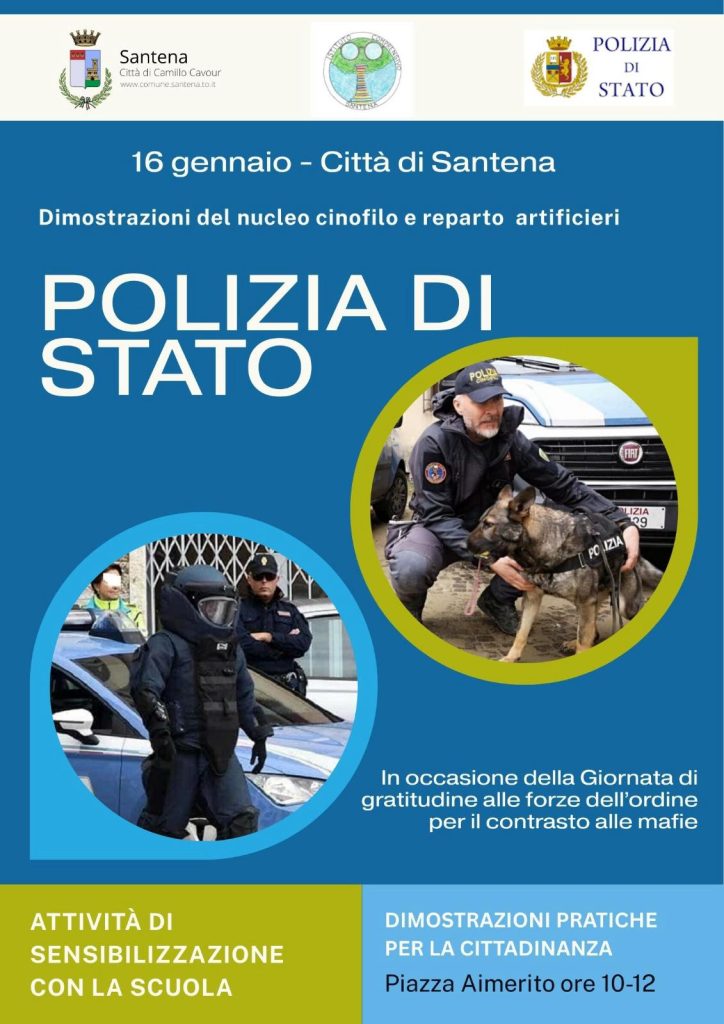 Venerdì 16 gennaio la Città di Santena ospiterà una giornata di sensibilizzazione dedicata alla legalità e alla sicurezza, realizzata in collaborazione con la Polizia di Stato, in occasione della Giornata di gratitudine alle forze dell’ordine per il contrasto alle mafie.