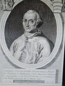 Figlio di una nobile e antica famiglia novarese, Giovanni Cacciapiatti (ritratto nella foto) ricoprì importanti cariche in Vaticano, senza mai dimenticare Novara, la sua città d’origine, nel regno di Sardegna, dove nasce l’8 marzo 1751. Era figlio di Carlo Emmanuele Cacciapiatti e Giuseppa Cacciapiatti. Non abbiamo informazioni sulla sua formazione scolastica. Fu Abbreviatore di parco maggiore dal settembre 1774 e Referendario dei Tribunali della Segnatura Apostolica di Giustizia e di Grazia dal 22 giugno dell’anno seguente. Divenne Vice-legato in Romagna dal 17 marzo 1776 e fino al 1782, commendatario dell’abbazia di Sant’Albino in Mortara dal 1788 fino al 1799, Relatore della Sacra Consulta dal novembre 1782 per 18 anni, Delegato apostolico a Urbino dal 1801 al 1806, Revisore generale delle cause della Camera Apostolica nel 1808. Era inoltre Abate commendatario di San Giulio di Dulzago nella diocesi di Novara dal 1795.