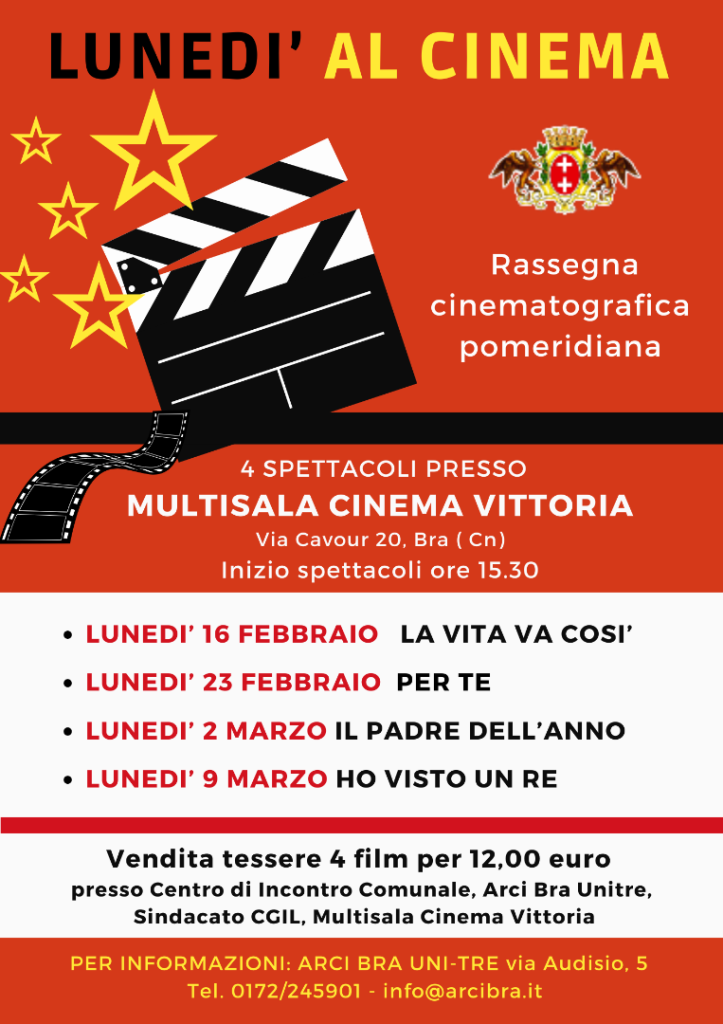 La tessera di abbonamento è acquistabile presso il Centro di Incontro di via Montegrappa, l’Arci Unitre o direttamente al cinema Vittoria prima delle proiezioni. Per informazioni: Arci Bra, via Audisio 5, tel. 0172-245901.