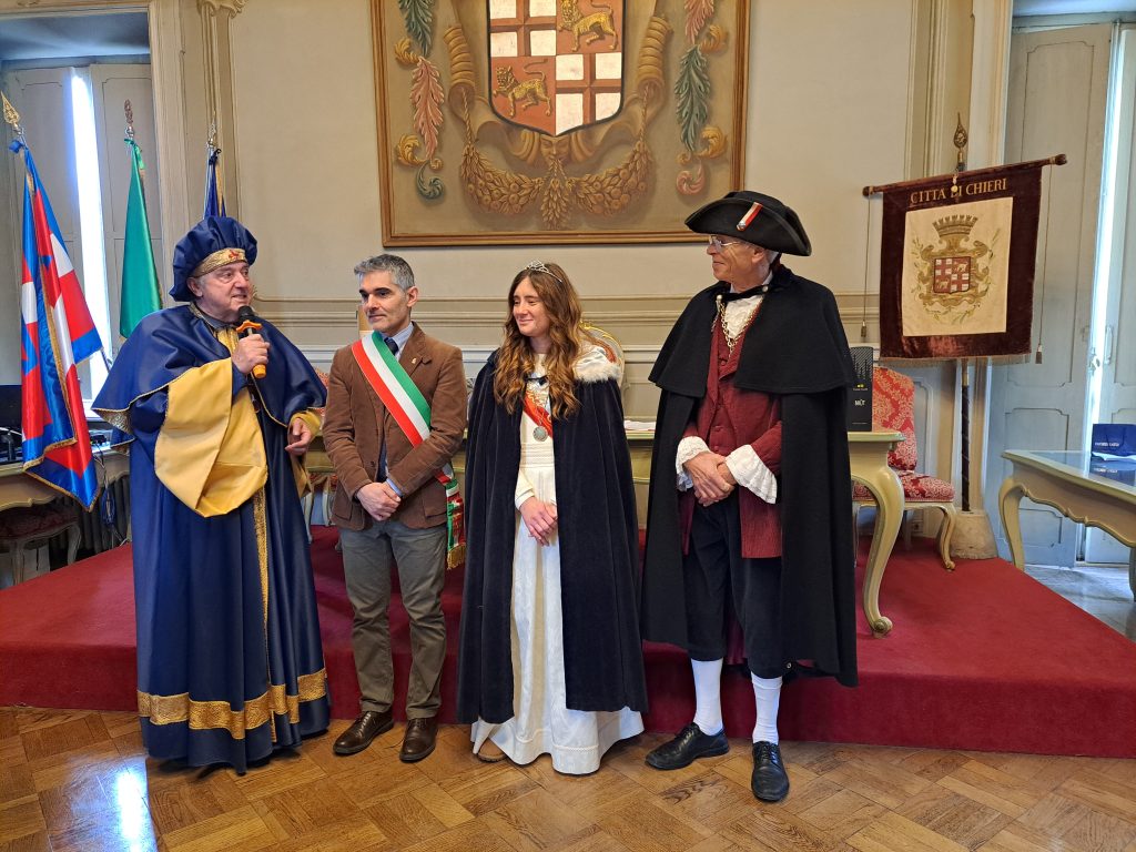 A Chieri, sabato mattina nella Sala Consiliare del Comune, la consueta investitura della Bela Tessioira, Michela Ronco e del Mangiagrop, Giovanni Fasano che dà l’avvio al Carnevale Chierese.