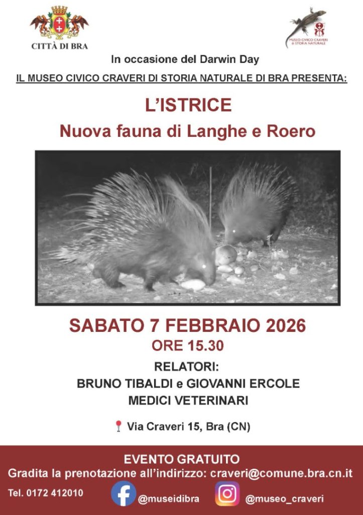 Il Museo civico Craveri di Storia naturale propone per sabato 7 febbraio 2026 la conferenza “L’istrice. Nuova fauna di Langhe e Roero”. L’incontro si terrà a partire dalle 15.30 nei locali del museo, in via Craveri 15, e vedrà come relatori i medici veterinari Bruno Tibaldi e Giovanni Ercole.