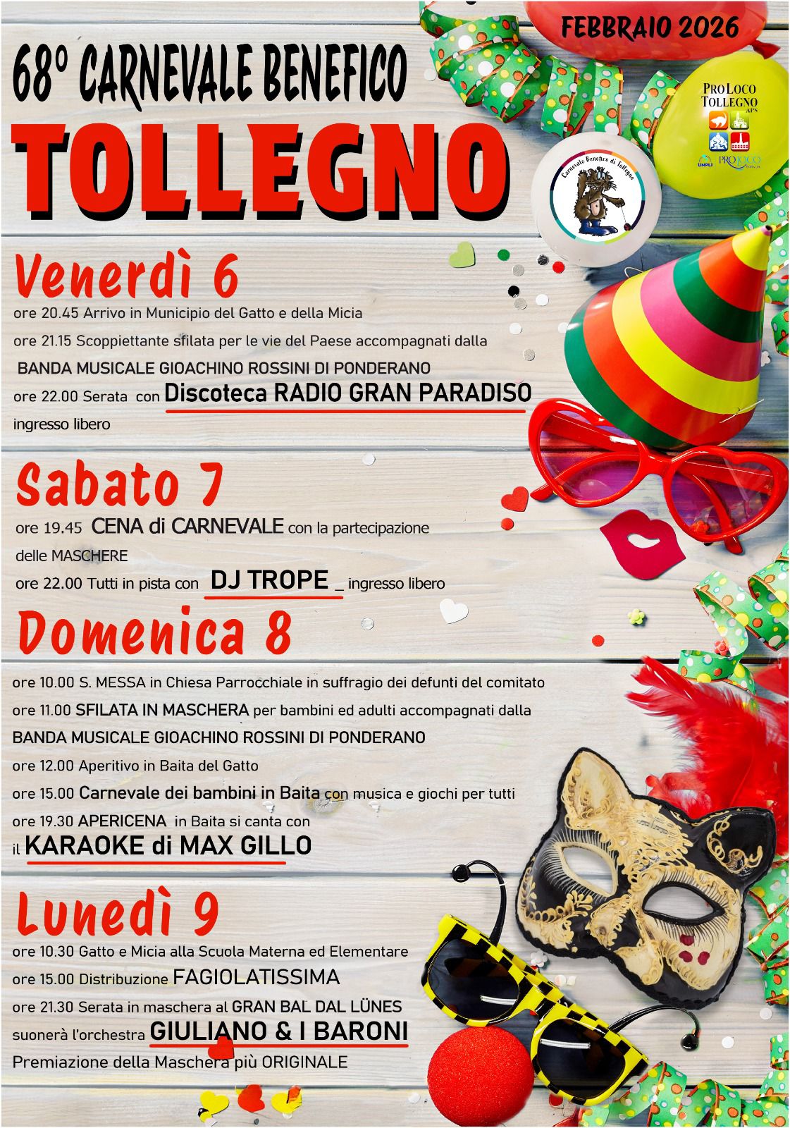 TOLLEGNO Da venerdì 6  a lunedì 9 febbraio “CARNEVALE BENEFICO”