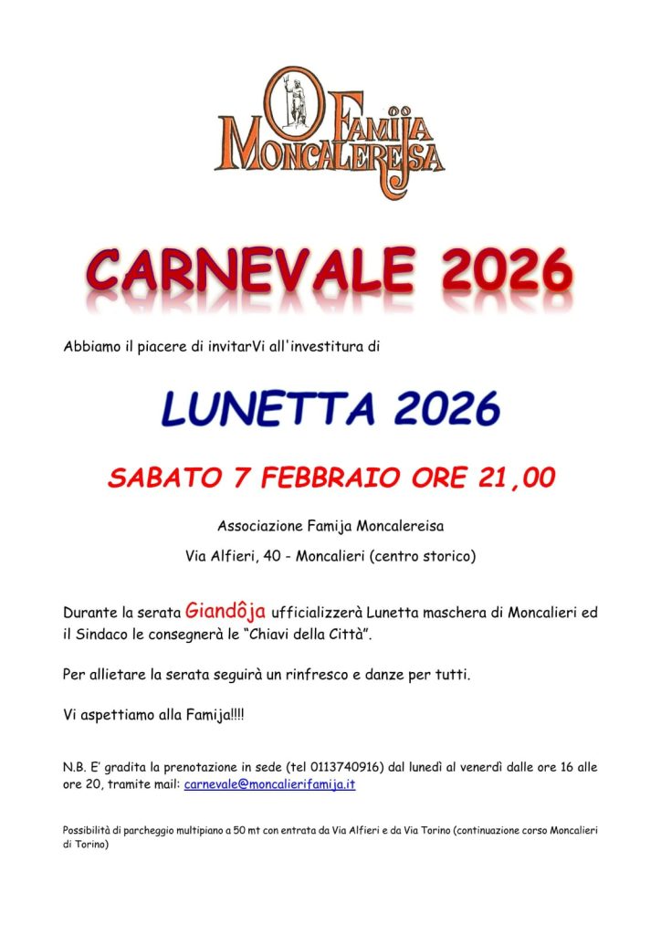 MONCALIERI (TO). Sabato 7 febbraio “Investitura della LUNETTA2026”
