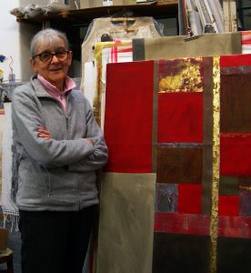 Incontri, frammenti di identità, collage di reti, lamiere e foglie di rame o d’oro, diventano testimonianze e presenze, modulazioni cromatiche e singolare spazio visuale. E soprattutto stabiliscono una relazione diretta e indissolubile tra Angela, il colore e la luce che trasforma una misuratissima gestualità pittorica in dimensione poetica, scandita su superfici che hanno il fascino di reperti e messaggi di antiche storie.