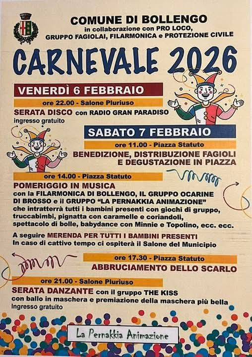 BOLLENGO (TO). Venerdì 6 sabato 7 febbraio “CARNEVALE 2026”.