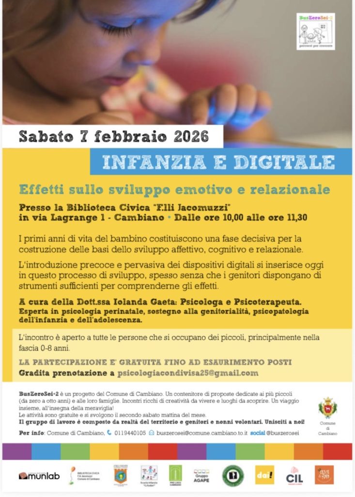 L’incontro si terrà sabato 7 febbraio alle 10 nella sala conferenze della Biblioteca Civica “F.lli Jacomuzzi” in via Luigi Lagrange 1 a Cambiano. Sarà l’occasione per riflettere insieme sull’impatto delle tecnologie digitali nella vita quotidiana dei bambini, con particolare attenzione ai primi anni di sviluppo e alla qualità delle relazioni affettive ed educative. È prevista una breve introduzione teorica seguita da un ampio spazio di dialogo, domande e condivisione dei vissuti, nella convinzione che la conoscenza psicologica possa diventare uno strumento concreto di prevenzione e di sostegno al benessere individuale e familiare.