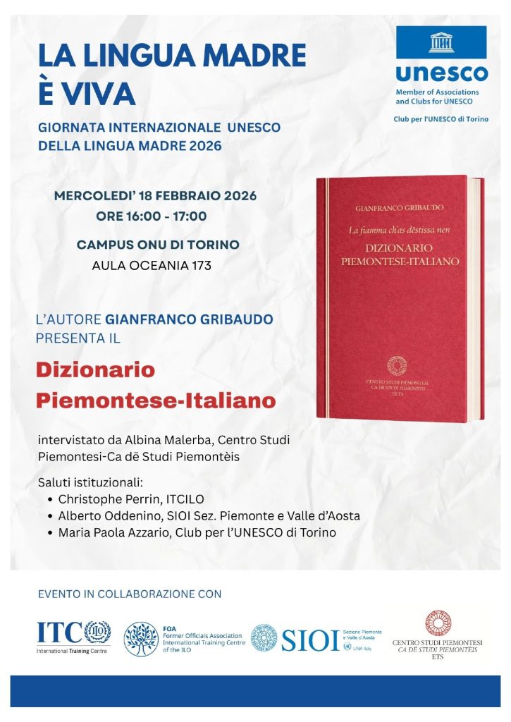 Per la Giornata Internazionale UNESCO della Lingua Madre 2026, Mercoledì 18 febbraio alle ore 18,00 presso il Campus ONU di Torino, presentazione del Dizionario Piemontese-Italiano di Gianfranco Gribaudo (edizioni Centro Studi Piemontesi, 2025)