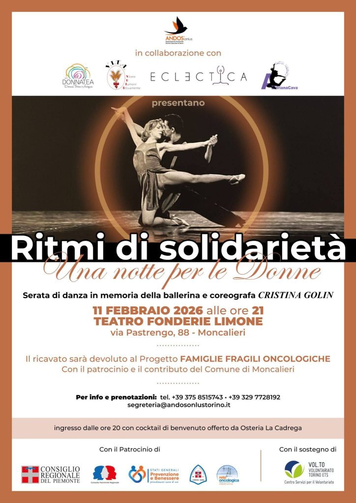 Mercoledì 11 febbraio alle 21 alle Fonderie Limone a Moncalieri andrà in scena “Ritmi di Solidarietà – Una notte per le Donne”, una serata di danza, passione e sensibilizzazione. Su impulso del Comune di Moncalieri è nata la preziosa rete tra le associazioni che si occupano di prevenzione e benessere della persona, soprattutto dei più fragili: Andos, Donna Tea, V.I.T.A. ODV (Vivere Il Tumore Attivamente), in collaborazione con Eclectica e Adriana Cava Dance Company che hanno contribuito alla conduzione artistica della serata. L’iniziativa gode oltre al patrocinio e contributo del Comune di Moncalieri e Vol.To, anche dei patrocini gratuiti del Consiglio Regionale del Piemonte, della Consulta Regionale Femminile e degli Stati Generali Prevenzione e Benessere, Azienda Zero e della Rete Oncologica. L’intento della serata sarà quello di offrire un sostegno concreto alle famiglie, dove l’intero ricavato della serata sarà devoluto al progetto “Protezione Famiglie Fragili Oncologiche”, un’iniziativa fondamentale per offrire supporto ai nuclei familiari che affrontano la sfida della malattia in condizioni di fragilità. Lo spettacolo si articolerà in due momenti: nella prima parte della serata dal titolo “Note d’autore” si esibirà la Compagnia Adriana Cava Dance Company. Saranno scelti brani musicali di autori di qualità italiani e stranieri. La danza e la musica daranno vita a coreografie ricche di emozioni, di passione, di gioia e di spiritualità, che metteranno in risalto l’armonia dei corpi in movimento dei danzatori della Compagnia, con danzatori di grande valore artistico ed espressivo. Nella seconda parte della serata, Eclectica presenterà lo spettacolo “Orlando”, che racconta il viaggio di una protagonista condizionata da un contesto storico e da rigide norme di genere. Attraverso una trasformazione continua — da uomo a donna e da donna a uomo — Orlando attraversa il tempo, l’amore e la solitudine per emanciparsi dai ruoli imposti e affermare la propria libertà. La metamorfosi diventa così metafora della fluidità dell’identità, del cambiamento e della possibilità di essere, oltre ogni definizione sociale. È possibile prenotare la partecipazione alla serata e sostenere il progetto con un’offerta minima consigliata di 15 euro. Le associazioni mettono a disposizione il numero telefonico / WhatsApp: +39 375 8515743 oppure +39 329 7728192 oppure scrivere alle mail: segreteria@andosonlustorino.it oppure info@adrianacava.it