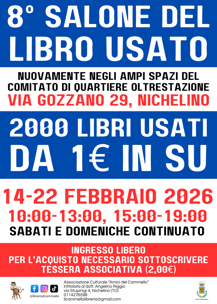 Il Salone del Libro Usato si terrà presso il Comitato di Quartiere Oltrestazione, in via Gozzano 29 (Nichelino), da sabato 14 a domenica 22 febbraio, con orario 10:00–13:00 e 15:00–19:00 (orario continuato il sabato e la domenica). La sede si trova a circa 400 metri dalla stazione ferroviaria di Nichelino ed è raggiungibile con le linee GTT 14, 35 e 39.