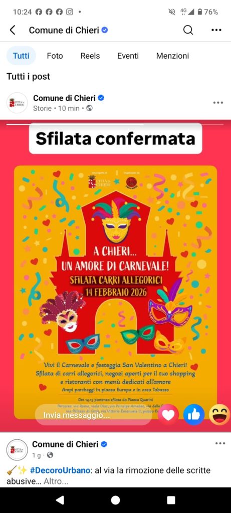 Chieri. Carnevale, Comune e Pro Loco: “Sfilata confermata” partenza alle ore 15,00 da Piazzale Quarini.