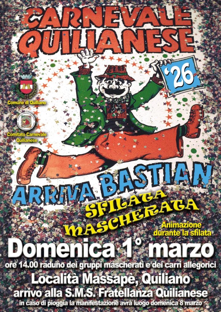QUILIANO (SV) . Domenica 1 marzo “ARRIVA BASTIAN” con la sfilata mascherata.