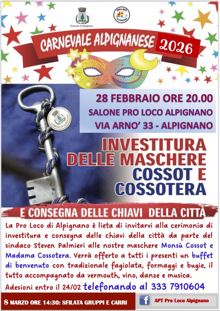 ALPIGNANO (TO) . Sabato 28 febbraio Investitura delle maschere COSSOT e COSSOTERA.