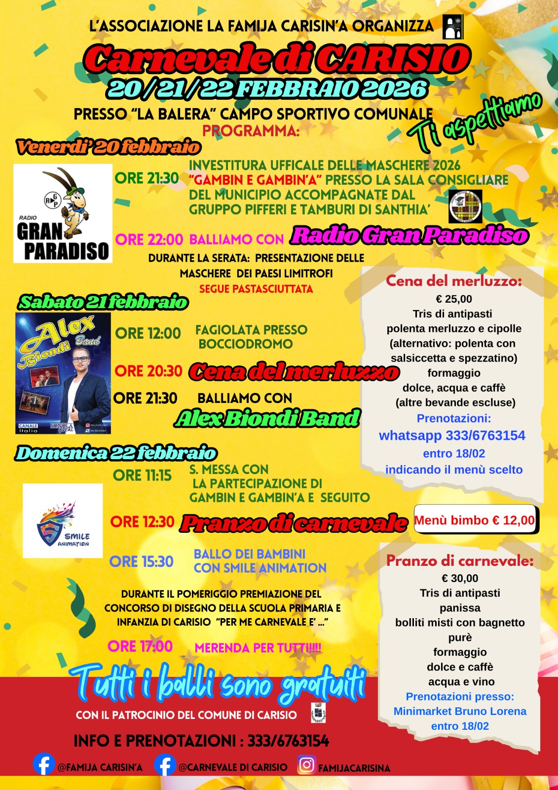 CARISIO (VC). Dal 20 al 22 febbraio “CARNEVALE DI CARISIO”