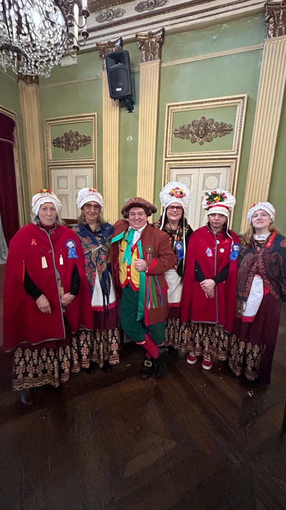 Nella foto: GIANDUJA (Davide Gozzi) con le sue GIACOMETTE (Morena Fissore, Maria Rosa Passarella, Sara Quero, Monica Primo, Rosanna Poetto) nel Comune di Pinerolo.