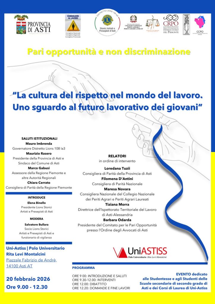 “La cultura del rispetto nel mondo del lavoro. Uno sguardo al futuro lavorativo dei giovani”: è il titolo del convegno in programma venerdì 20 gennaio, dalle 9 alle 12:30, al polo universitario Rita Levi Montalcini di Asti.