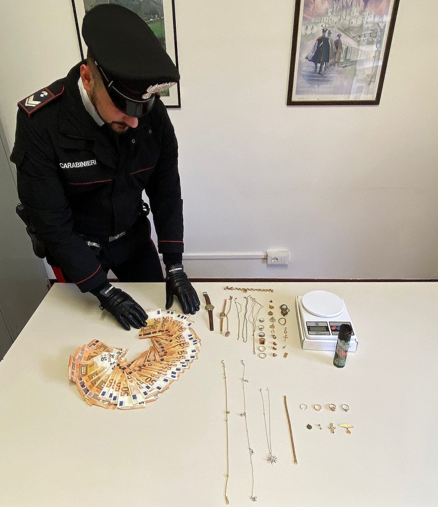 Il controllo è stato poi esteso alla camera d’albergo dei due fermati, dove, nascosti in un trolley, i Carabinieri hanno trovato 2.800 euro in contanti e due involucri con vari gioielli, ritenuti provento dei furti.