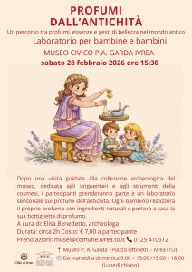 Il Museo Civico P. A. Garda di Ivrea propone un nuovo appuntamento dedicato ai più piccoli: “Profumi dall’Antichità”, un laboratorio esperienziale alla scoperta dei profumi, delle essenze e dei gesti di bellezza nel mondo antico.