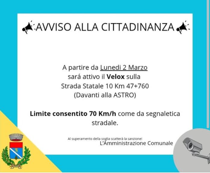 A partire da Lunedi 2 Marzo sarà attivo il Velox sulla Statale 10 al km 47+760. Lo rende noto sui social il Comune di Baldichieri d’Asti