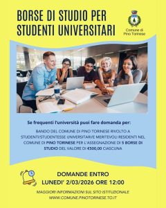 Il Comune di Pino Torinese ha pubblicato un bando rivolto a studenti/studentesse universitari/e meritevoli, residenti a Pino, per l’assegnazione di n. 5 borse di studio del valore di €500,00 ciascuna.