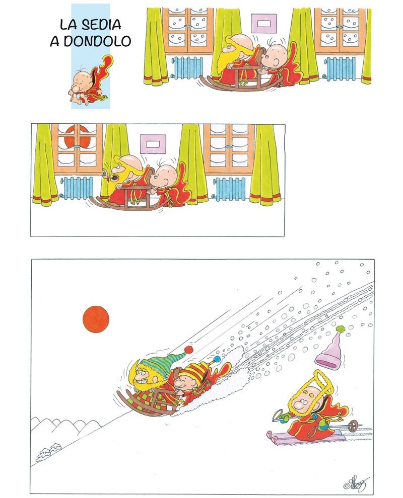 Fra Tino, come i suoi confratelli, veste un saio rosso che risalta sulle pagine delle sue coloratissime avventure, le quali hanno la particolarità di essere tutte – o quasi – mute. Nei tre volumi pubblicati da Sbam! Comics, solo un’avventura è infatti accompagnata da un testo scritto. È quella che dà il titolo al libro, Il Natale di Fra Tino, ed è anche l’unica storia lunga, di ben 20 pagine. Non vi sono i ballon dei dialoghi, ma una filastrocca accompagna le vignette, un po’ come negli storici fumetti del Signor Bonaventura. In questa simpatica storiella scopriamo così il nome degli altri frati che abitano il convento e compaiono nelle storie di Fra Tino, tra cui il forzuto Fra Cassone, il testardo Fra Capoccia, il sempre distratto Fra Tacchione, il bonaccione Fra Tanto e il sarto Fra Poco.