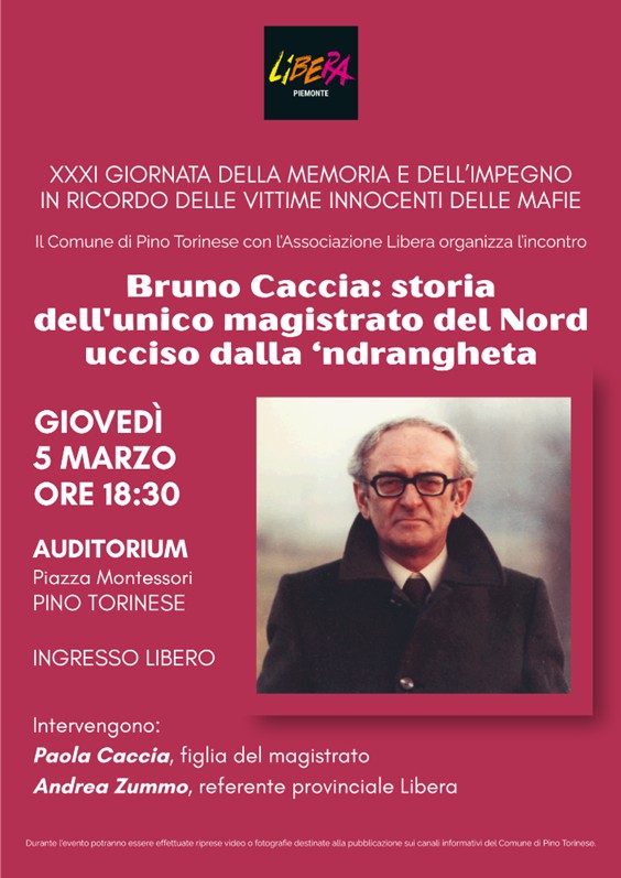 In occasione della XXXI Giornata nazionale della memoria e dell’impegno in ricordo delle vittime delle mafie (21 marzo), il Comune di Pino Torinese e l’Associazione Libera Piemonte organizzano l’incontro “Bruno Caccia: storia dell’unico magistrato del Nord ucciso dalla ‘ndrangheta”, che si terrà giovedì 5 marzo alle ore 18:30 presso l’Auditorium del Centro Polifunzionale. Intervengono Paola Caccia, figlia del magistrato, e Andrea Zummo, referente provinciale di Libera.