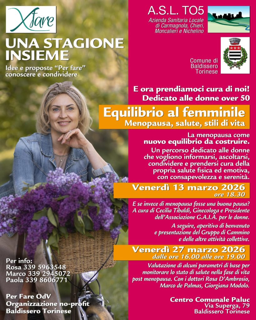 Venerdì 13 marzo alle 18,30, al Centro Comunale Paluc di via Superga 79 a Baldissero Torinese, si terrà il primo appuntamento dell’iniziativa dell’Associazione XFare “Equilibrio al femminile, menopausa, salute e stili di vita”, dedicato alle donne che hanno superato i 50 anni.Il secondo appuntamento è previsto sempre al Centro Comunale Paluc il 27 marzo dalle 16 alle 19.