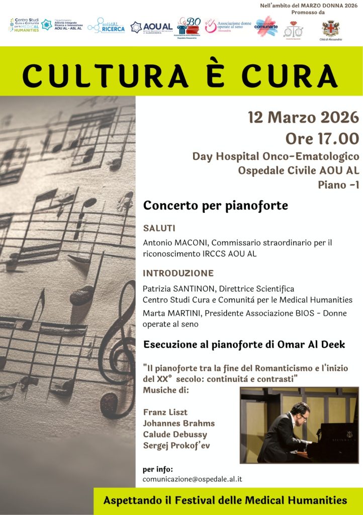Nell’ambito delle iniziative di “Aspettando il Festival delle Medical Humanities”, il ciclo di appuntamenti promosso dal Centro Studi Cura e Comunità per le Medical Humanities del Dipartimento Attività Integrate Ricerca e Innovazione (DAIRI) , giovedì 12 marzo alle ore 17.00 presso il Day Hospital Onco – ematologico dell’Azienda Ospedaliero – Universitaria di Alessandria si terrà il concerto del pianista Omar Al Deek, organizzato in collaborazione con l’Associazione Comunarte, l’Associazione Amici della Biblioteca dell’Ospedale ODV, l’Associazione Donne Operate al Seno BIOS e Solidal per la Ricerca.