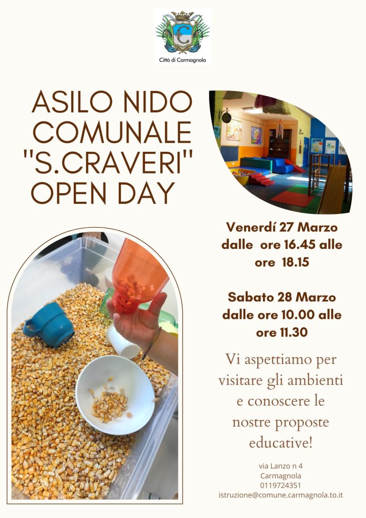 L’asilo nido comunale “S. Craveri”, storica realtà educativa di Carmagnola da oltre 45 anni, apre le porte alle famiglie con bambini da 8 mesi a 3 anni, invitando a conoscere più da vicino la struttura e le sue proposte educative.