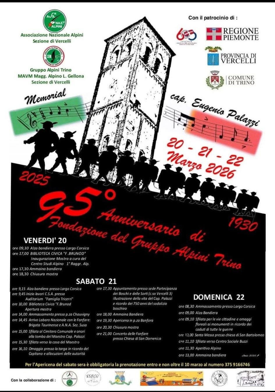TRINO (VC) . Da venerdì 20 a domenica 22 marzo 95° anniversario fondazione Gruppo Alpini Trino.
