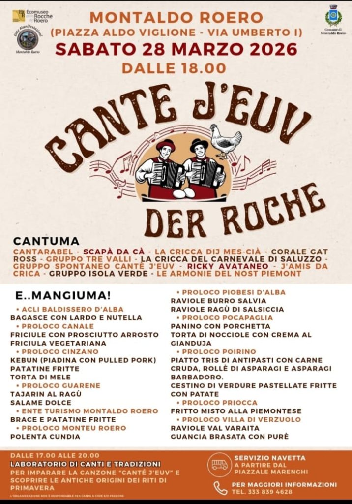 MONTALDO ROERO (CN). Sabato 28 marzo “CANTE J’EUV DER ROCHE”