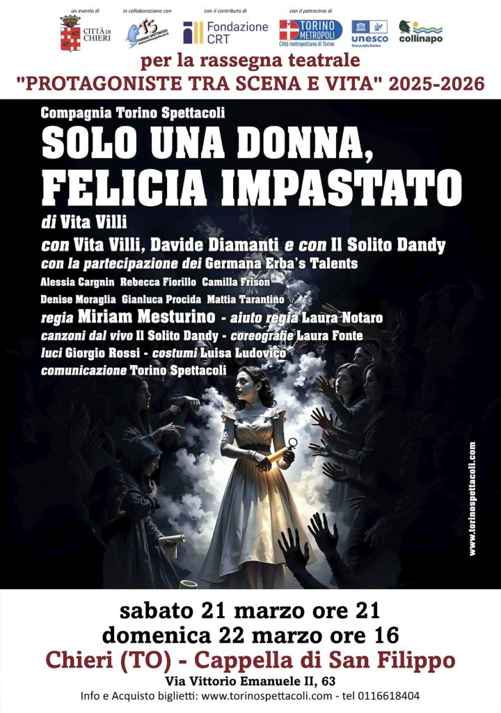 SOLO UNA DONNA, FELICIA IMPASTATO sarà in scena sabato 21 marzo ore 21 e domenica 22 marzo, alle ore 16, nel suggestivo contesto della Cappella San Filippo nel centro storico di Chieri (TO), uno scrigno che si apre a un appuntamento di teatro.