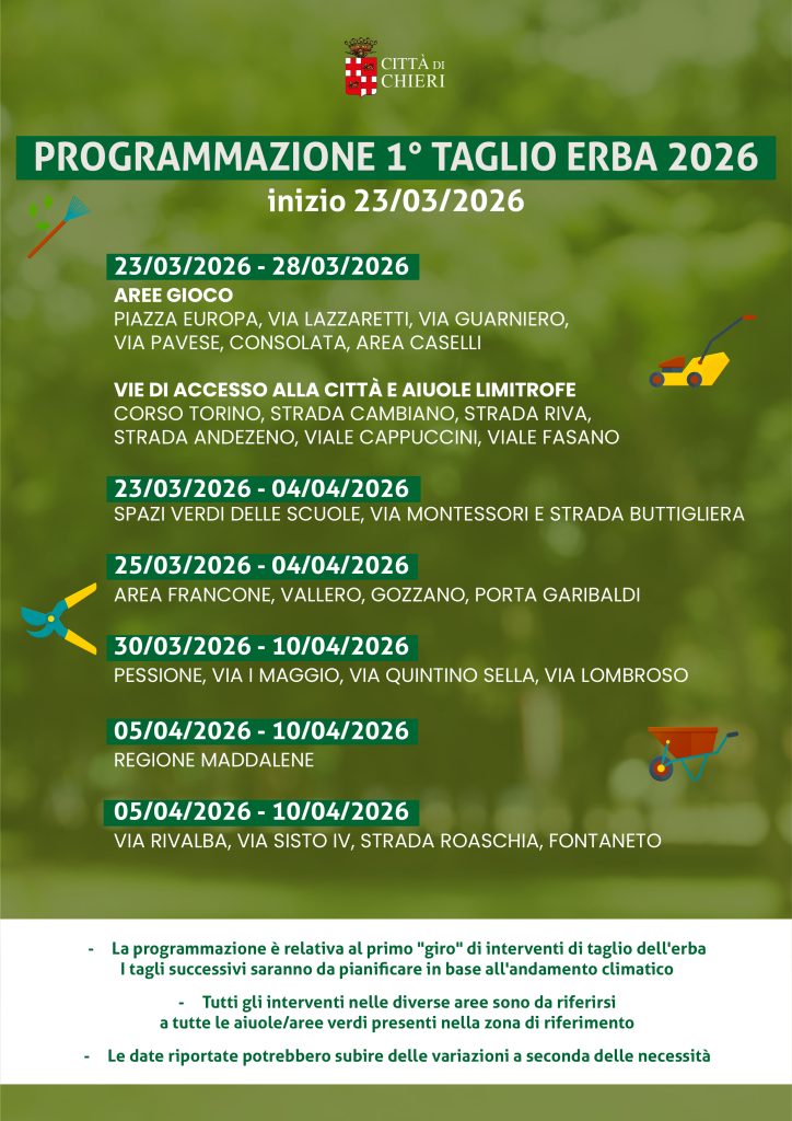 Dal 23 marzo al 28 marzo sono previsti interventi di taglio dell’erba nelle aree gioco di Piazza Europa, Via Lazzaretti, via Guarniero, Via Pavese, Consolata e area Caselli, e nelle vie di accesso a Chieri, ovvero Corso Torino, Strada Cambiano, Strada Riva, Strada Andezeno, Viale Cappuccini e Viale Fasano. Tutti gli interventi interesseranno tutte le aiuole e le aree verdi presenti nella zona di riferimento.