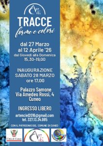Dal 27/03/26 al  12/04/26  le sale del prestigioso Palazzo  Samone di Cuneo si trasformano in un luogo di incontro, emozione e scoperte grazie alla mostra collettiva “TRACCE – Forme e Colori”, che riunisce 33 artisti contemporanei provenienti da diverse esperienze e linguaggi espressivi.  – Nomi  degli Artisti: Fernanda Prudenzano, Luciana Audisio, Claudio Cavallera, Lorenzo Caula, Maria Cavallo, Celeste Bisotto, Carol De Lucia, Gianni Armando, Daniel Adascalidei, Sabina Bonifacio, Fabrizio Oberti, Marica Servolo, Assunta Mellano, Alessandro Lavagna,          Egidio Giubergia, Valter Chiardola, Raffaele Caneto, Chiara Fornaro, Francesca Finello,Nikolinka Nikolova,           Marco Gasparin, Sergio Ghirelli, Lavinia Latorre, Mariarosa Palma, Silvio Papale, Ornella Pozzetti, Enrico Prelato, Felice Rosamarin, Michelina Serale,  Albino Somano, Alessandra Vinotto, Stefania Zamburlini, Fausto Zanni.
