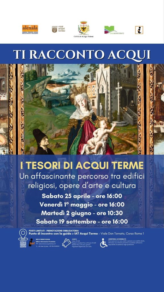Un affascinante percorso tra edifici religiosi, opere d’arte e cultura. Accompagna i visitatori tra le vie del centro storico, svelando storie di arte, architettura e spiritualità. Si parte dal cuore della città, camminando tra chiese e scorci che raccontano secoli di storia. La Chiesa di San Francesco, custode di preziose opere pittoriche, introduce al fascino religioso e artistico del centro, mentre Piazza della Bollente, con la sua celebre sorgente termale, rivela il simbolo più noto della città. Attraversando il borgo medievale della Pisterna, il cammino conduce alla maestosa Cattedrale di Santa Maria Assunta, vero scrigno di capolavori artistici. Salendo verso Piazza Duomo, si osservano edifici ecclesiastici di pregio, tra cui spicca il Palazzo Vescovile, edificio storico di grande valore architettonico. Nella vicina via Verdi si fa tappa alla Fondazione Jona Ottolenghi, edificio ricco di storia che si sviluppa sull’antico ospedale di Santa Maria Maggiore, che custodisce il gruppo bronzeo de “il Figliol Prodigo”. Si prosegue verso la Chiesa di Sant’Antonio, con arredi lignei e la volta affrescata da Pietro Ivaldi, detto “il Muto”. Il percorso si chiude con gli esterni della Basilica romanica dell’Addolorata, offrendo uno sguardo completo sulla ricchezza culturale e artistica di Acqui Terme.