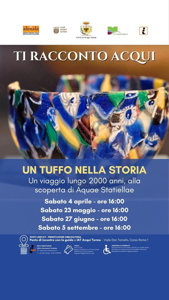 Un Tuffo nella storia: un viaggio lungo 2000 anni –  accompagna i visitatori alle radici più antiche della città, fino all’epoca romana e all’antica Aquae Statiellae. Camminando tra resti archeologici, mosaici e antichi edifici termali, si percepisce il passare dei secoli e la vita quotidiana di un tempo. La fontana pubblica, la casa del vasaio, l’anfiteatro e la piscina romana permettono di immaginare la quotidianità dei cittadini dell’epoca, mentre il Museo Archeologico nel Castello dei Paleologi amplia il racconto fino alla preistoria e al Medioevo, restituendo un quadro di continuità storica che lega passato e presente.
