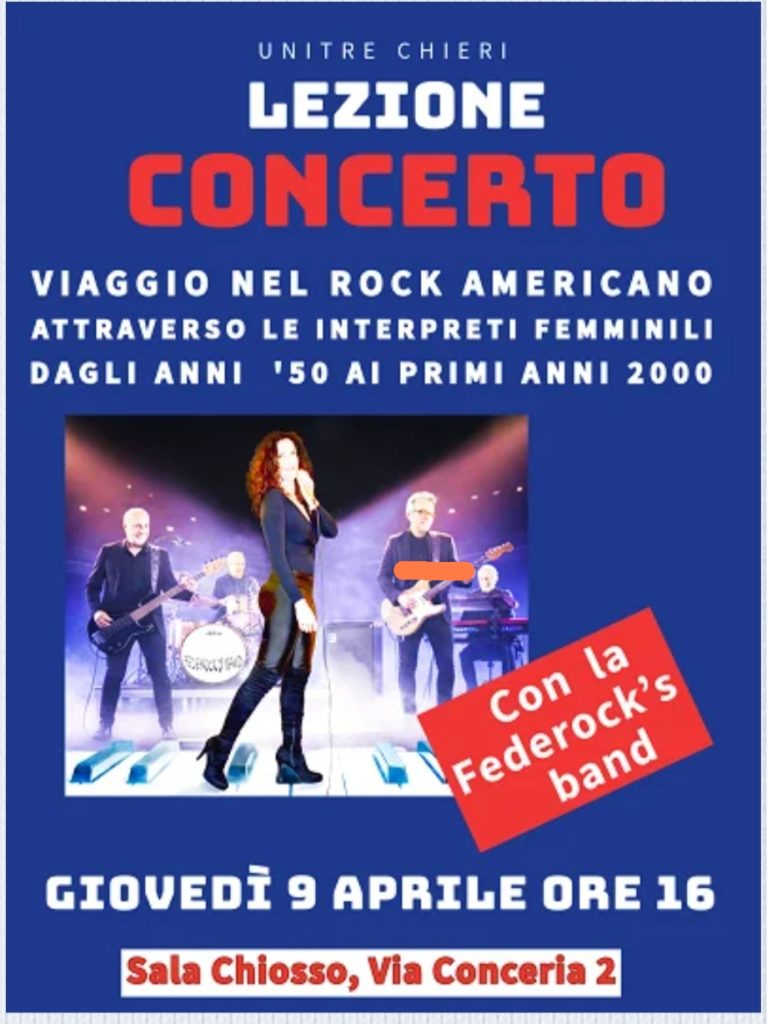 Un viaggio nel rock americano attraverso le interpreti femminili dagli anni ’50 ai primi anni 2000. Questo il tema della lezione-concerto dell’UNITRE di Chieri, giovedì pomeriggio in Sala Chiosso. Protagonista dell’evento la Federock’s Band: Cesare Matta Chitarra, Federica Riccobono Voce, Massimo Morelli Batteria, Roberto Piccolo basso e Giovanni Varetto tastiere.