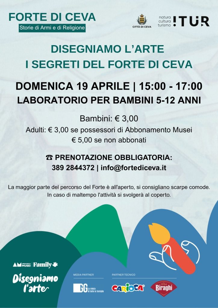 La stagione si apre con un appuntamento dedicato ai più piccoli: domenica 19 aprile (ore 15:00 – 17:00) si terrà “Disegniamo l’arte”, un laboratorio creativo organizzato in collaborazione con l’Associazione Abbonamento Musei, per scoprire i segreti del Forte disegnando; al termine dell’attività è prevista una gustosa merenda per tutti i bambini (costo per i bambini 5-12 anni: € 3,00; costo per gli adulti accompagnatori: € 3,00 se possessori di Abbonamento Musei € 5,00 se non abbonati).
